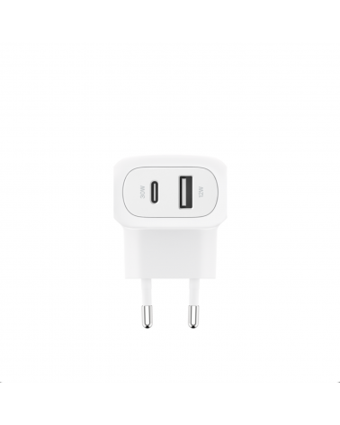 Recarga un iPhone o un smartphone de Samsung por carga rápida y al mismo tiempo que cargas otro dispositivo con nuestro cargador de pared doble de 42 W. Provisto de un puerto USB-C de 30 W y uno USB-A de 12 W. Cuenta con certificación USB-C PD 3.0 para suministrar una carga rápida a un iPhone, de 0 al 50 % en 21 minutos, o a determinados móviles de Samsung, de 0 al 50 % en 26 minutos.